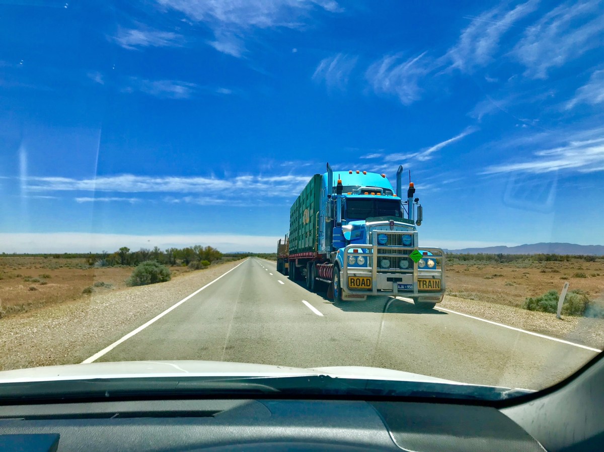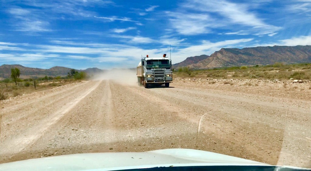 A dot on the horizon can take minutes to form into something meaningful. Usually it’s a white ute, but sometimes it’s a monster and you get the impression it will stop for nothing. Road train literally. Note Roo Bar.