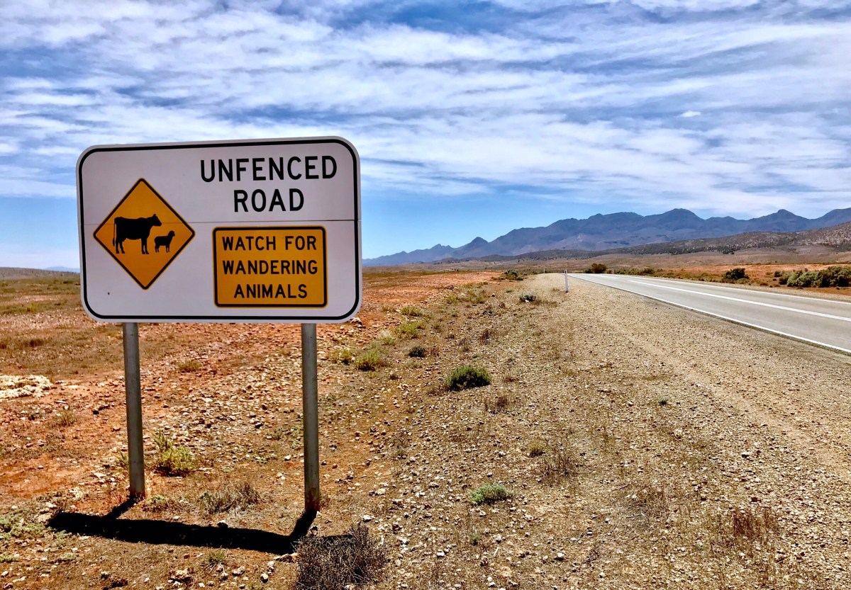 Warnings on the road. To the left – unphotographable [and out of shot!] you could just see the heat shimmer coming off lake Torrens, a salt pan that occupies the largest land area of any [when full] lake in the Southern Hemisphere