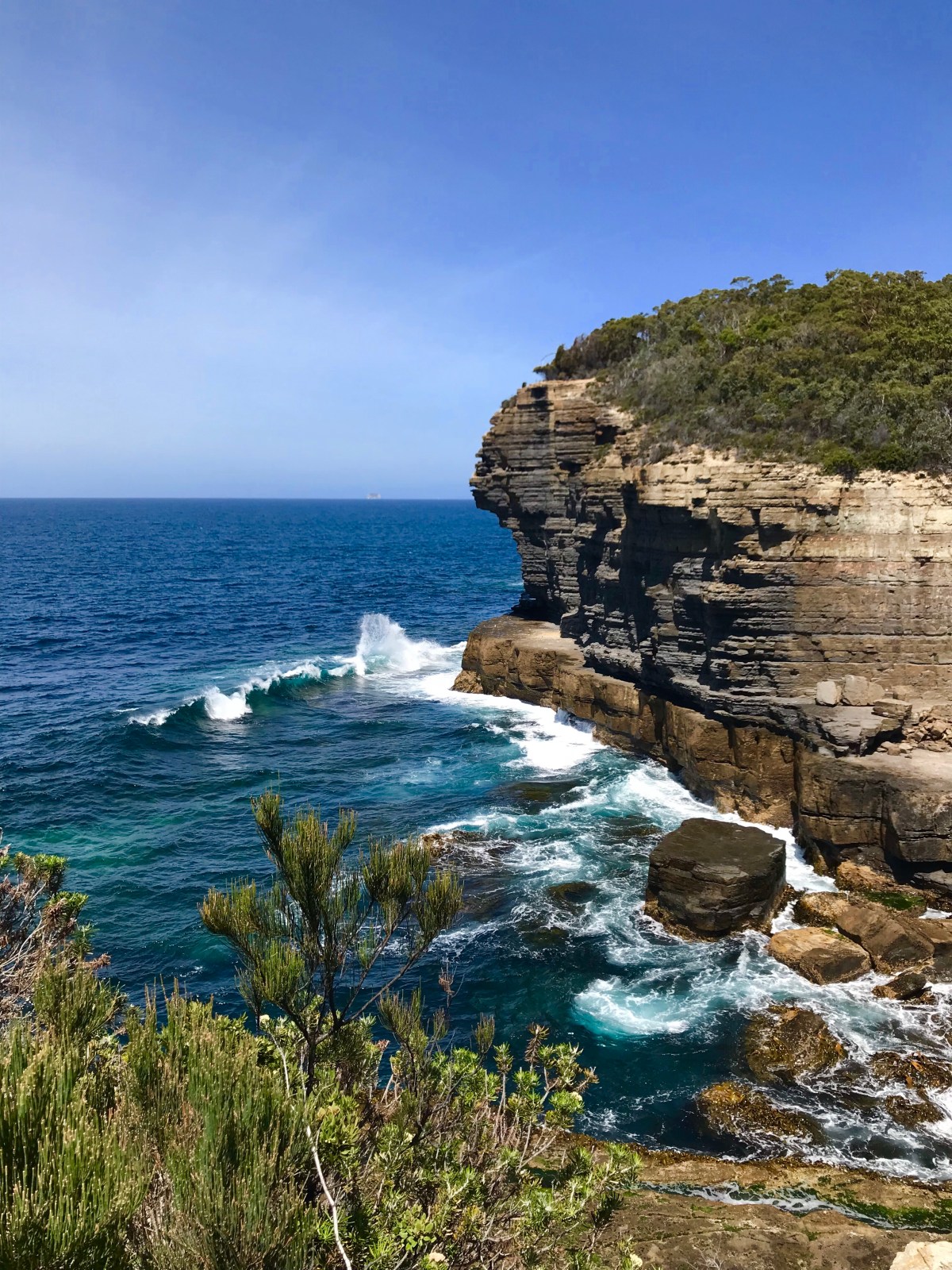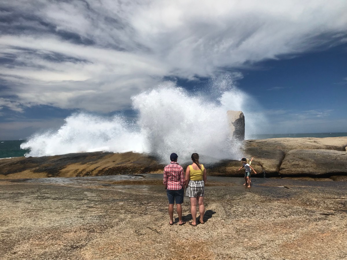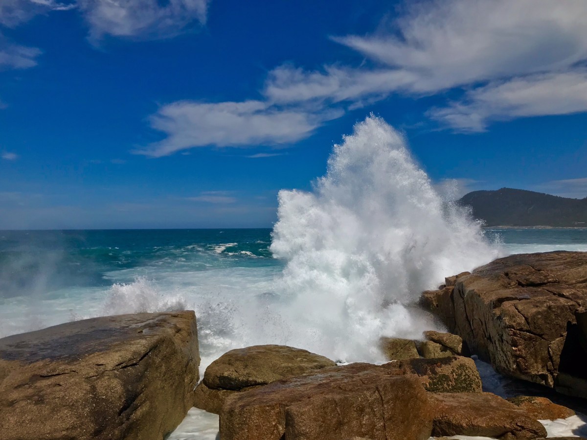 The ‘Blow Hole ‘ in Bicheno. A granite formation that makes for a huge explosion of water every time a sizeable wave hits. Children and adults alike were playing a game of ‘dare’, edging closer to where about 5 tonnes of water could be dumped. Minutes passed with nothing – people getting bolder or bored, would move closer to the wet zone; only to suddenly be caught out and drenched. It looks more dangerous than it was, but nevertheless it’d ruin your camera.