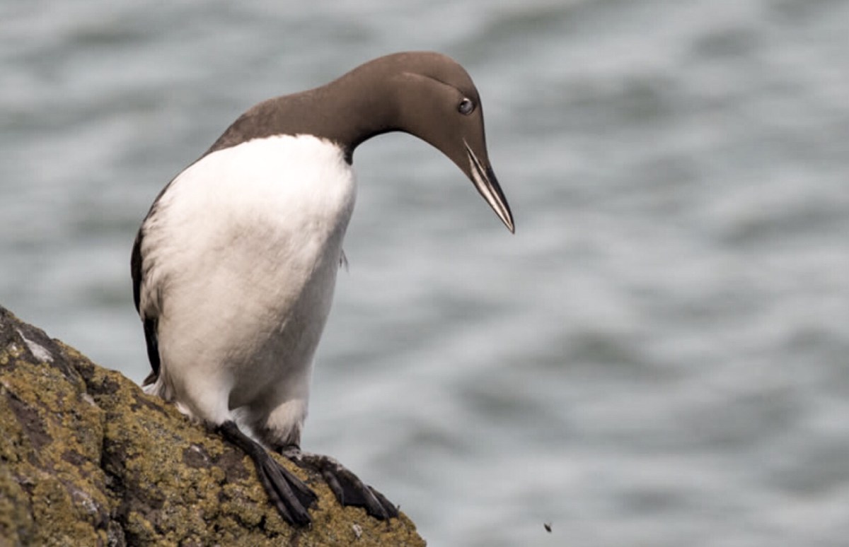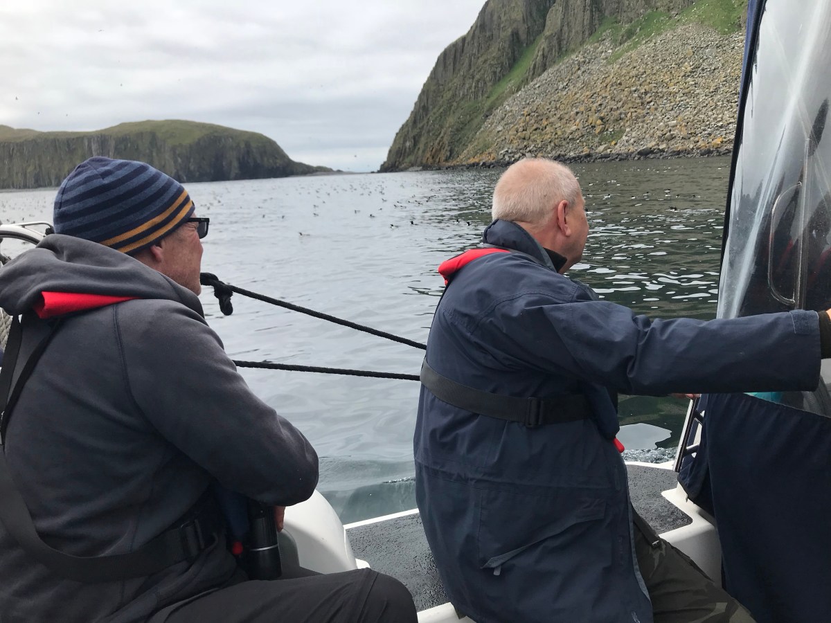 Close up we appreciated the difference between the Guillemot and its neighbour the Razorbill as our boat bobbed silently beneath the 400 foot basalt cliffs. Auks they are, as is the Puffin. Comical and ludicrous they seemed as they came and went – ineptly tumbling in the water before becoming airborne with whirring wingbeats.