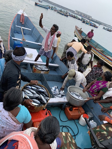 Below: Scenes from the fish market in Kovalam where stuff is auctioned off before even making it to terra firma. Fish porters [a new one on me] wait for their chance to carry the newly-bought produce to waiting tuk tuks