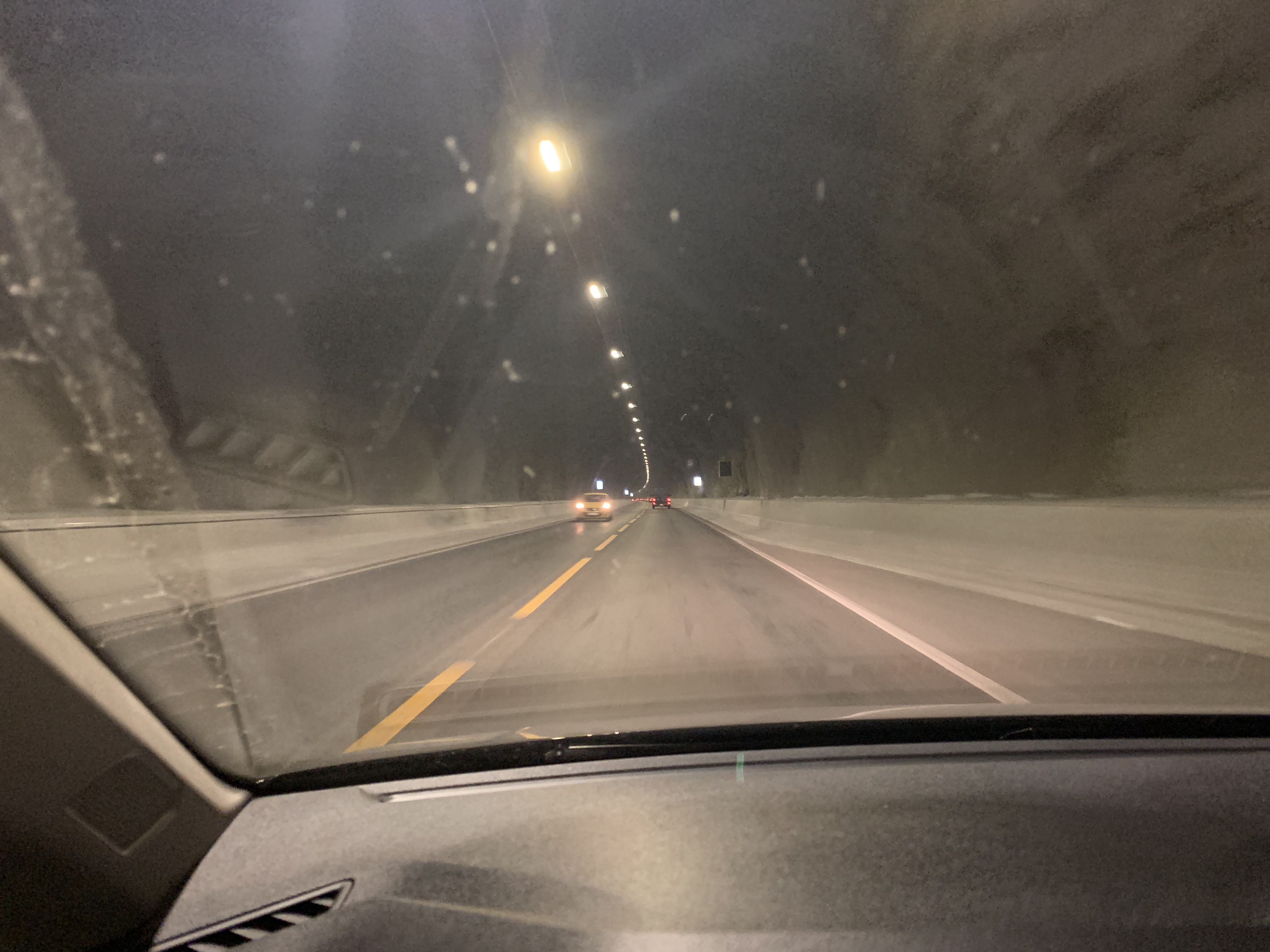 Below one of the many superbly engineered tunnels that had recently opened. I probably passed through 20 such, the longest being about 5 miles, and went right beneath a long fjord. Salty drips on the windscreen.