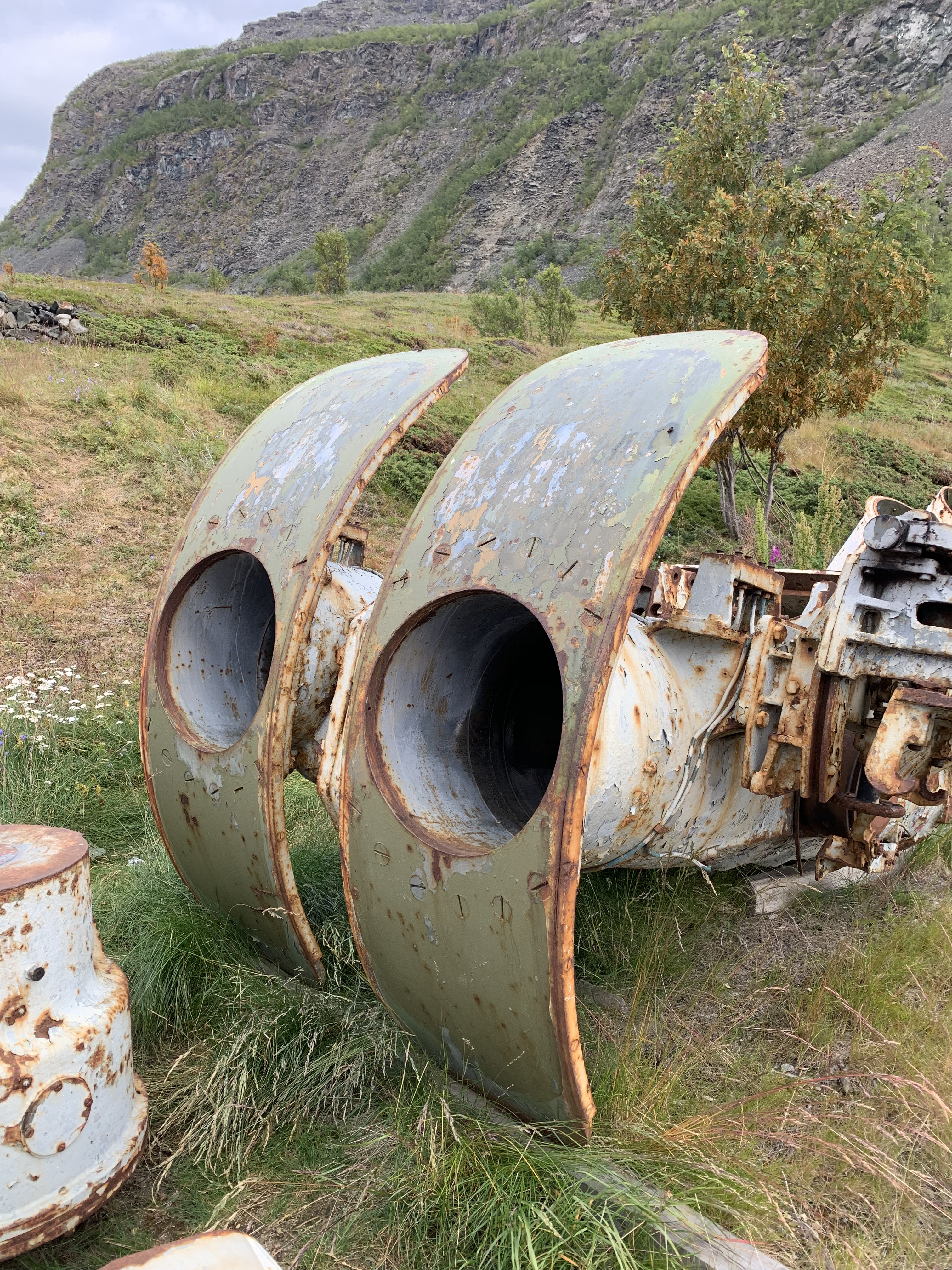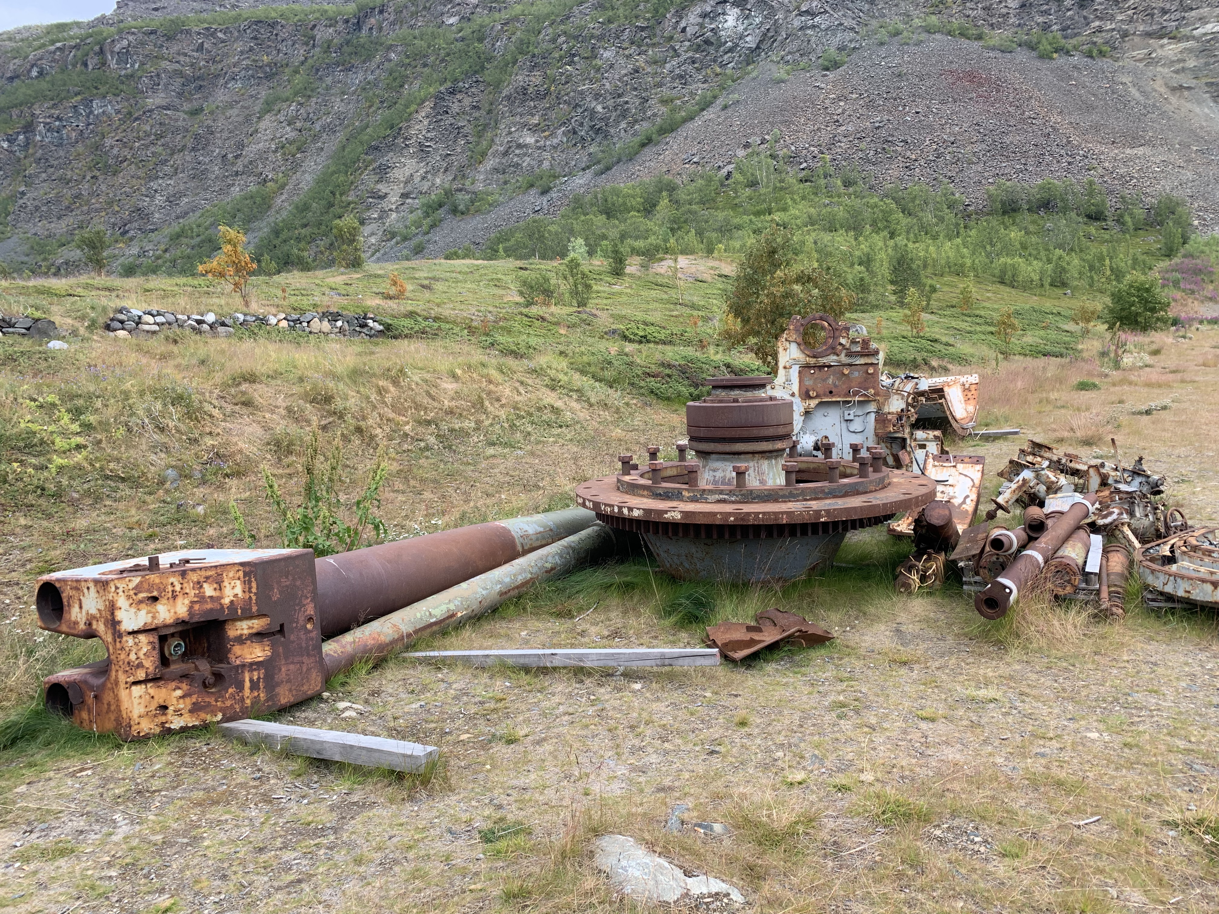 [In this remote fjord the wreckage from the repairs was just dumped on the shore. Although the seasonal weather may seem extreme to those who don’t live in the Arctic; there are effectively 2 ‘conditions’ – summer constant and winter frozen. The ageing process isn’t the same as elsewhere with the cycle of dampness/freezing and thawing which corrodes metal far faster. Stuff survives.]