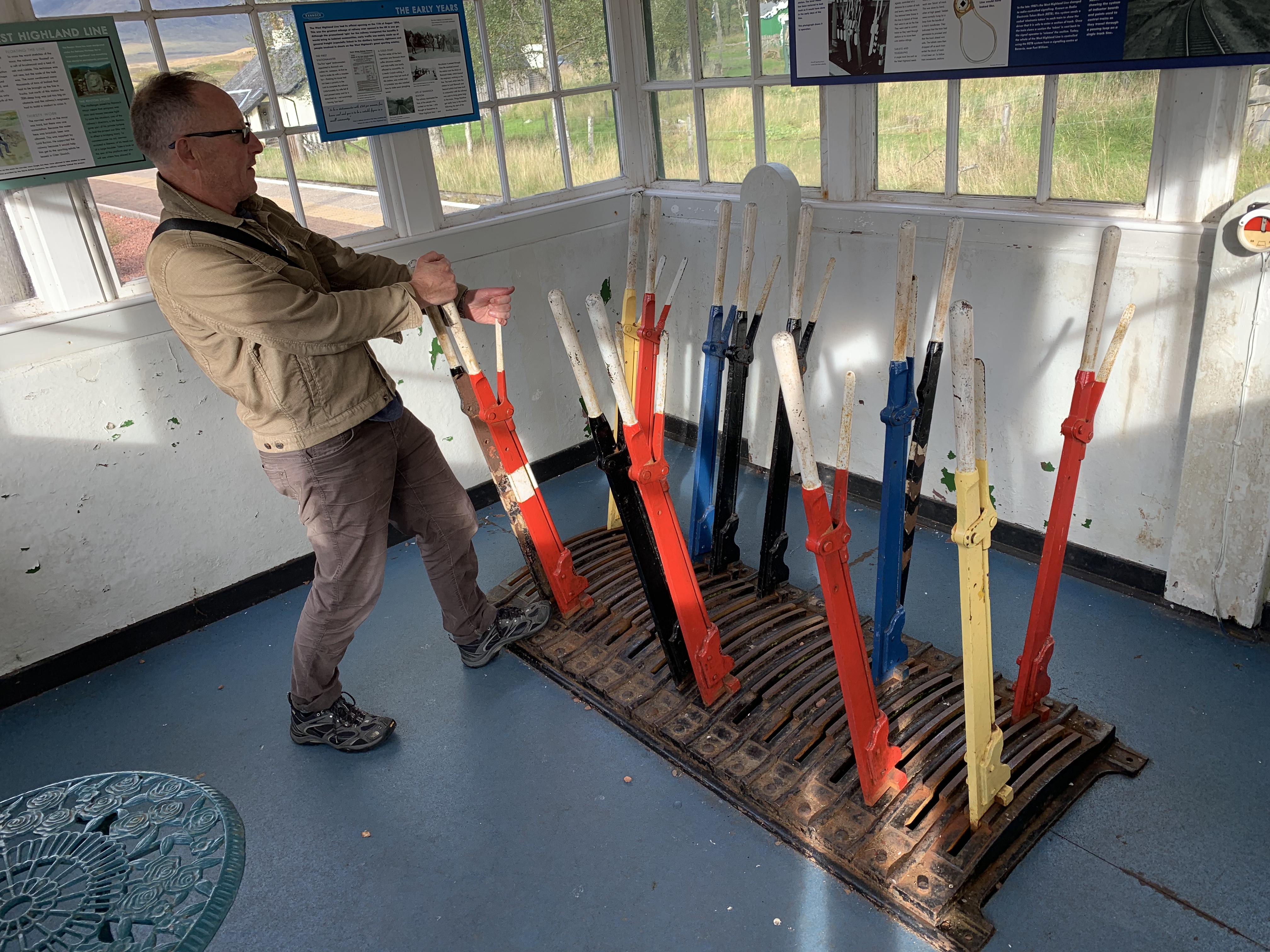 And a shot of someone who knows what to do. Not an act of hooliganism by the Fat Controller, just Terry play-acting in the old signal box.