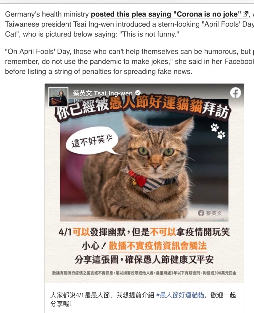 BBC News carries this story – basically saying that countries around the world were not going to be amused at the possibility of people basing April Fools’ Day pranks on the virus. Quite rightly so, but Wikipedia tells me that whilst the origin of this tradition is obscure; it quite clearly dates back to Medieval Europe, and not a ‘Hello Kitty’ tradition upheld in Taiwan. Below a Taiwanese Ministry post using a cat [edible?] to get the message across.
