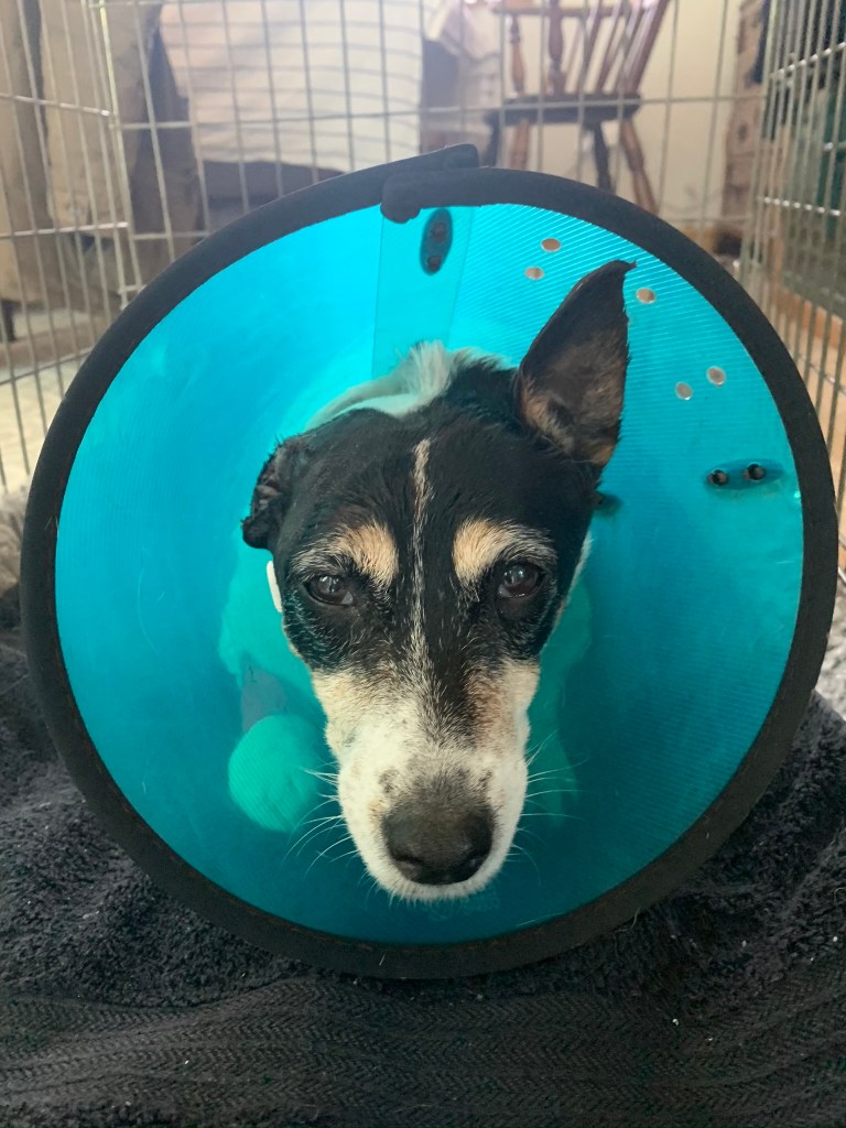The results from Dolly’s ear samples made bad news and she was taken to the vet for an operation to remove the nasty growth on her ear. Visiting the vet was different as we weren’t allowed access and had to leave the dog tethered outside