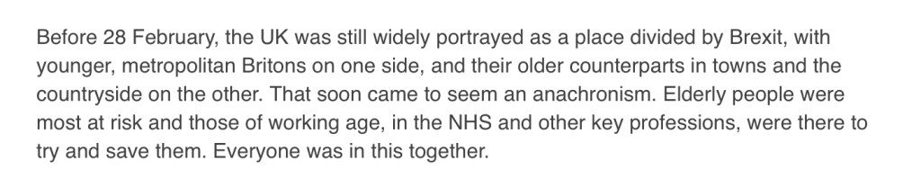 This was the week that Boris’s condition worsened and he was to spend 2 days in an Intensive Care Unit. Some cynically thought it was a kind of PR exercise; whereby the illness of a man of importance, an apparently fit 55 year old, would suddenly make a huge[r] tranche of the population sit up and think [if they hadn’t done so already], ‘that could be me’.