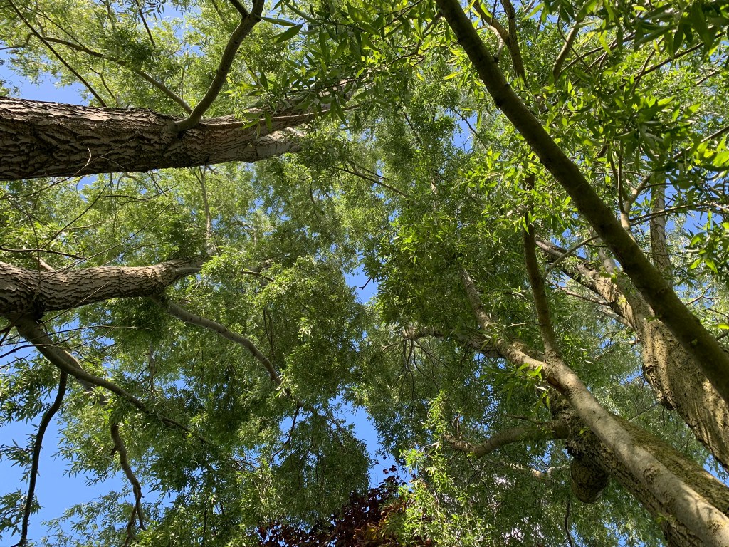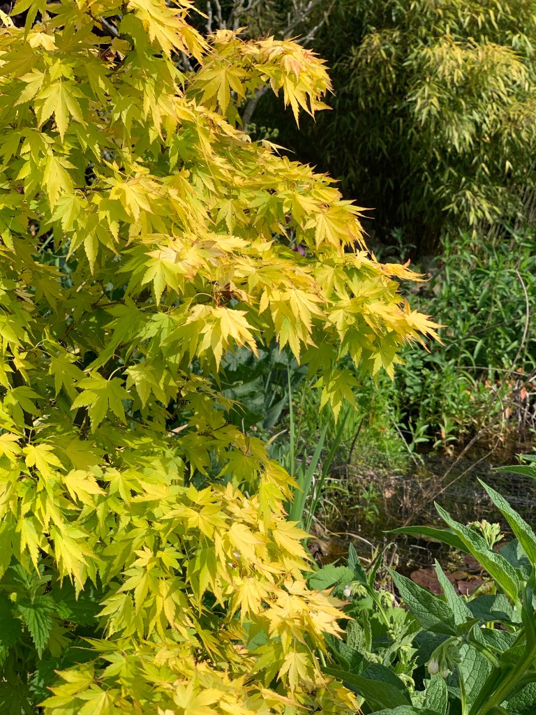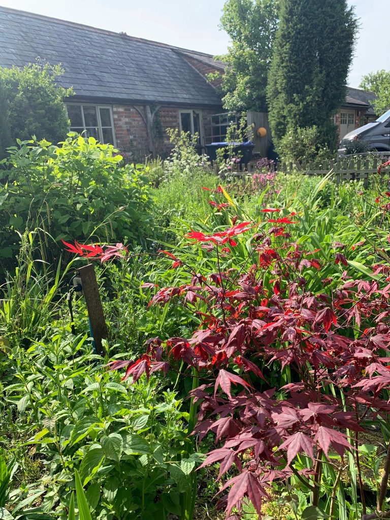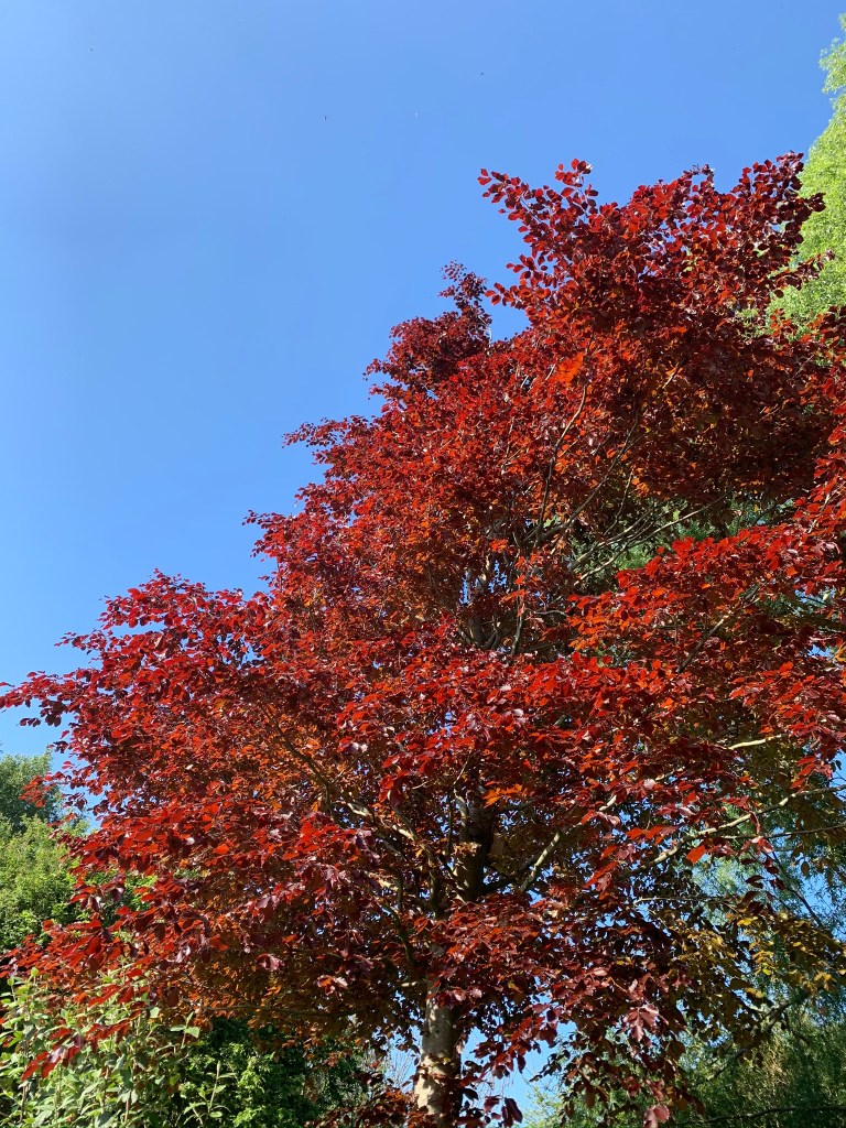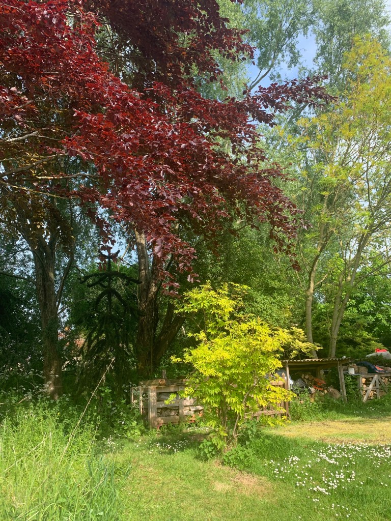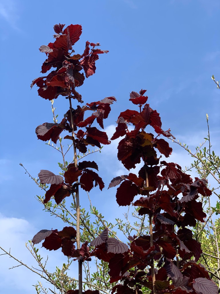 It doesn’t have to be green apparently, hence the profusion of alternatively coloured foliage. Here copper beech, purple hazel and some acers.
