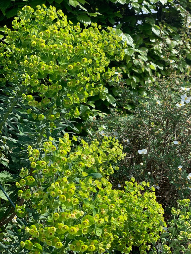 Common name spurge, this is found self-seeded all over the garden. To the unwary gardener it can cause incredibly painful skin irritation if its sticky sap gets onto the skin or worse still rubbed in to the eyes.