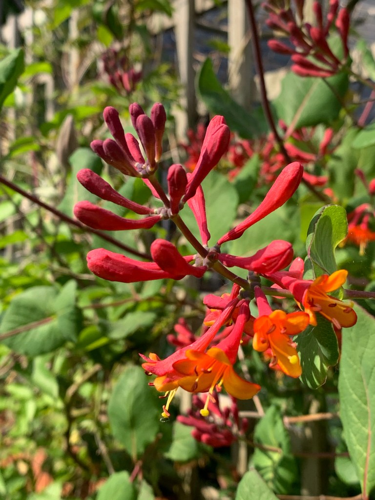 ‘The name honeysuckle comes from the tradition of children biting off the ends of the flowers to enjoy the drops of nectar inside‘